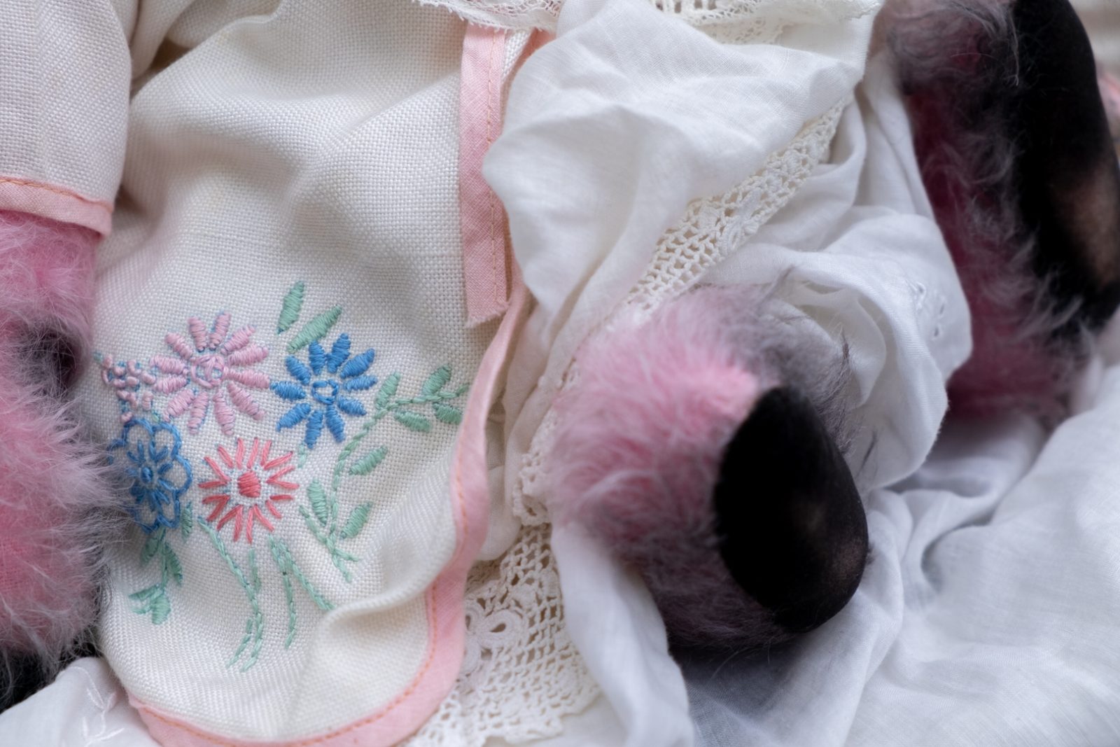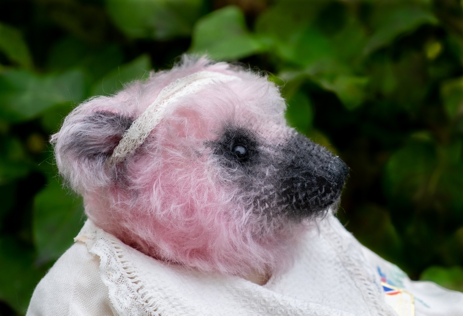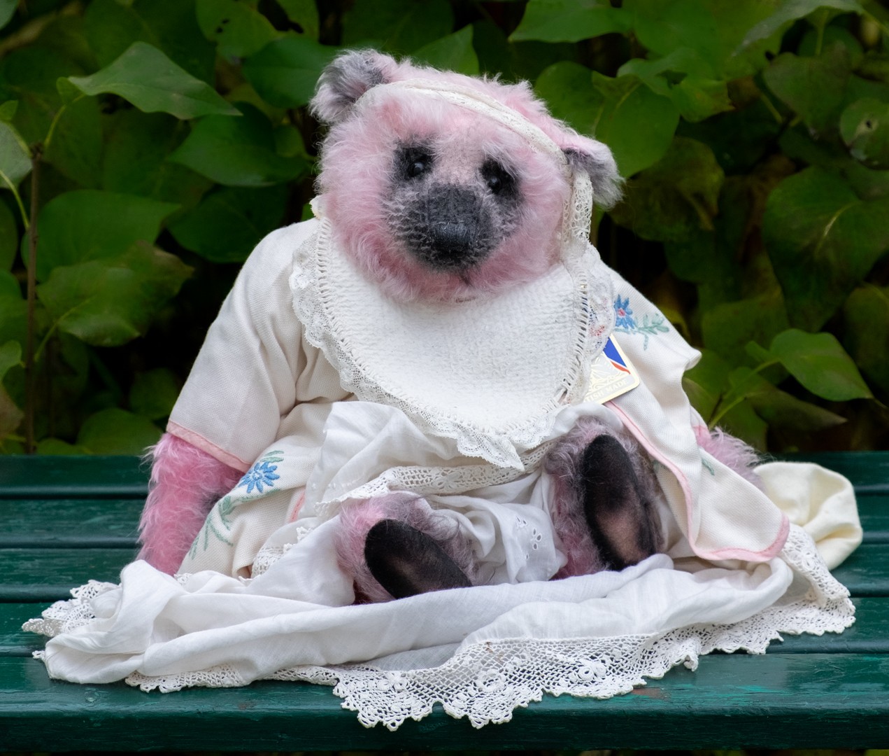 Baby Prudence is absolutely adorable. She is made of soft, rich pink mohair with black airbrush details. She is wearing a white cotton christening gown with lace details, a little creamy white dress with an embroidered bunny, a lovely little jacket with embroidered flowers in blue, pink and light green, a lace ribbon around her head, and on top of everything a bib with lace details. Baby Prudence measures approx. 43 cm / 17 inches.