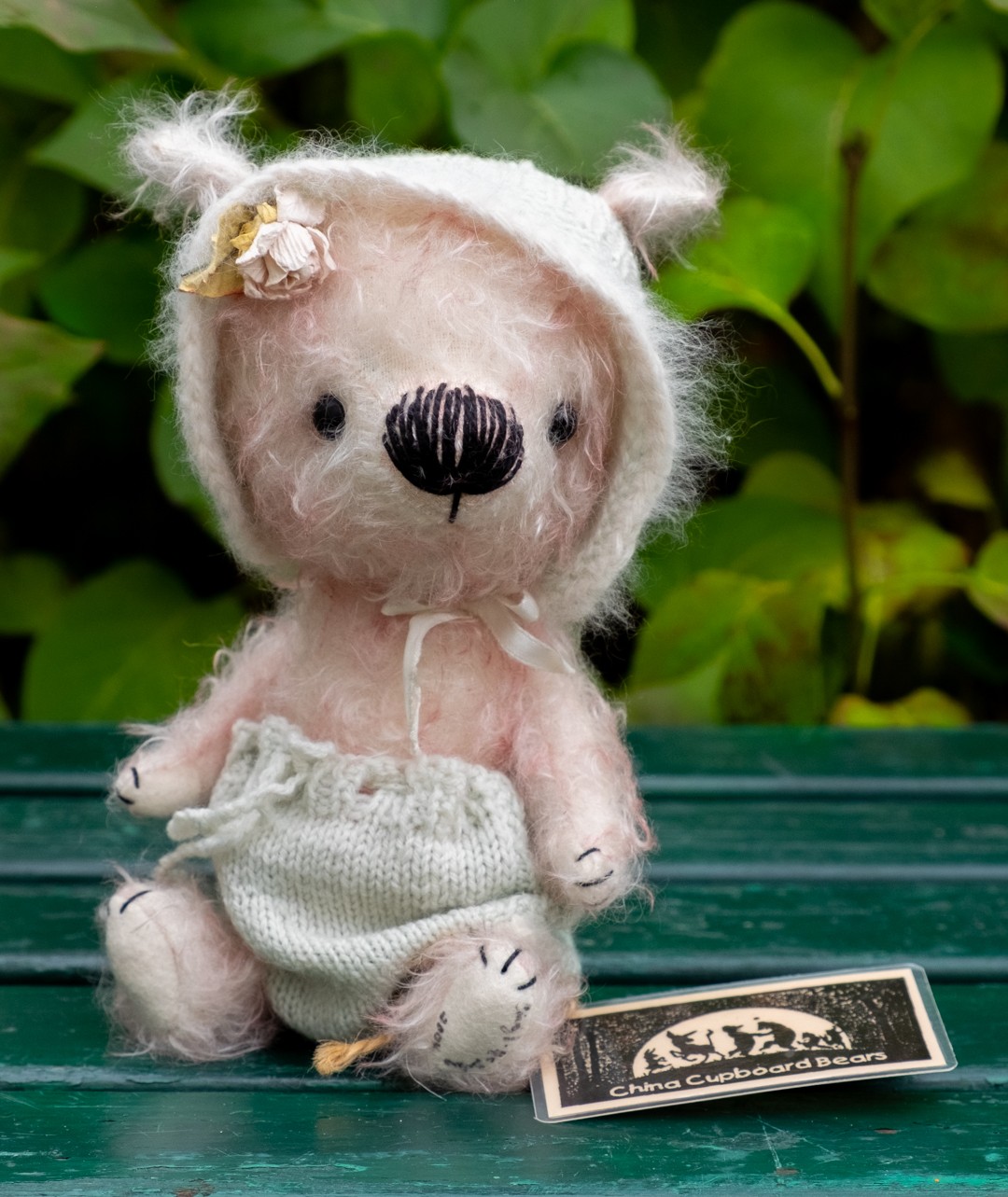 This is Felicity! The name means “hope, happiness and good luck” and is derived from the Latin word felicitas, which means “luck, good fortune”. When you look at this little darling baby you get the meaning instantly! Felicity was handmade in a limited edition – or OOAK edition – during the first decade of the 2000s, by American teddy bear artist Cindy McGuire for China Cupboard Bears. Felicity is made of finest light pink mohair with a white bottom. She has a large head compared to her body, and a very large hand-stitched nose, which I find absolutely adorable. I believe she could be said to belong to the Japanese anime tradition in style, with her over-exaggerated head compared to other body parts. She has black button eyes and paw pads made of felt, one foot pad is signed by Cindy. Felicity wears a vintage little baby bonnet and a pair of undies, both knitted in a pale mint green colour. She also has a little rose bud in her “hair”. Felicity measures approx. 22 cm / 9″ (seated) and she comes in perfect condition.