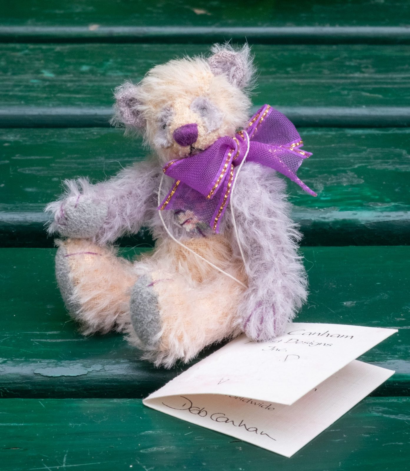 Little Blush is a shy, little clown Blush measures 9 cm / 3.5 inches and is made of a light lavender and light beige apricot mohair of finest quality. Dark lilac nose and claws, grey suede paw pads and tiny shoe button eyes. Blush has a lilac bow around the neck and comes with the original tag and box.