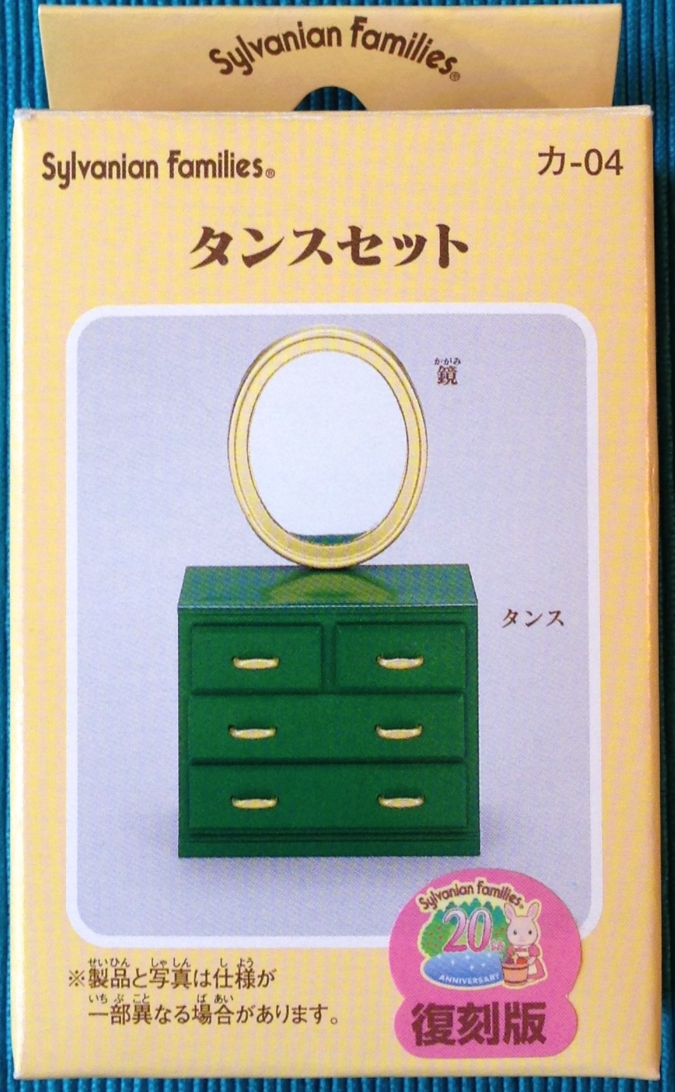 Japanese collection Sylvanian Families. Green Chest of Drawers with gold-framed Mirror. 20th Anniversary Set. © 2004 Epoch Co., Ltd. Mint in original box.