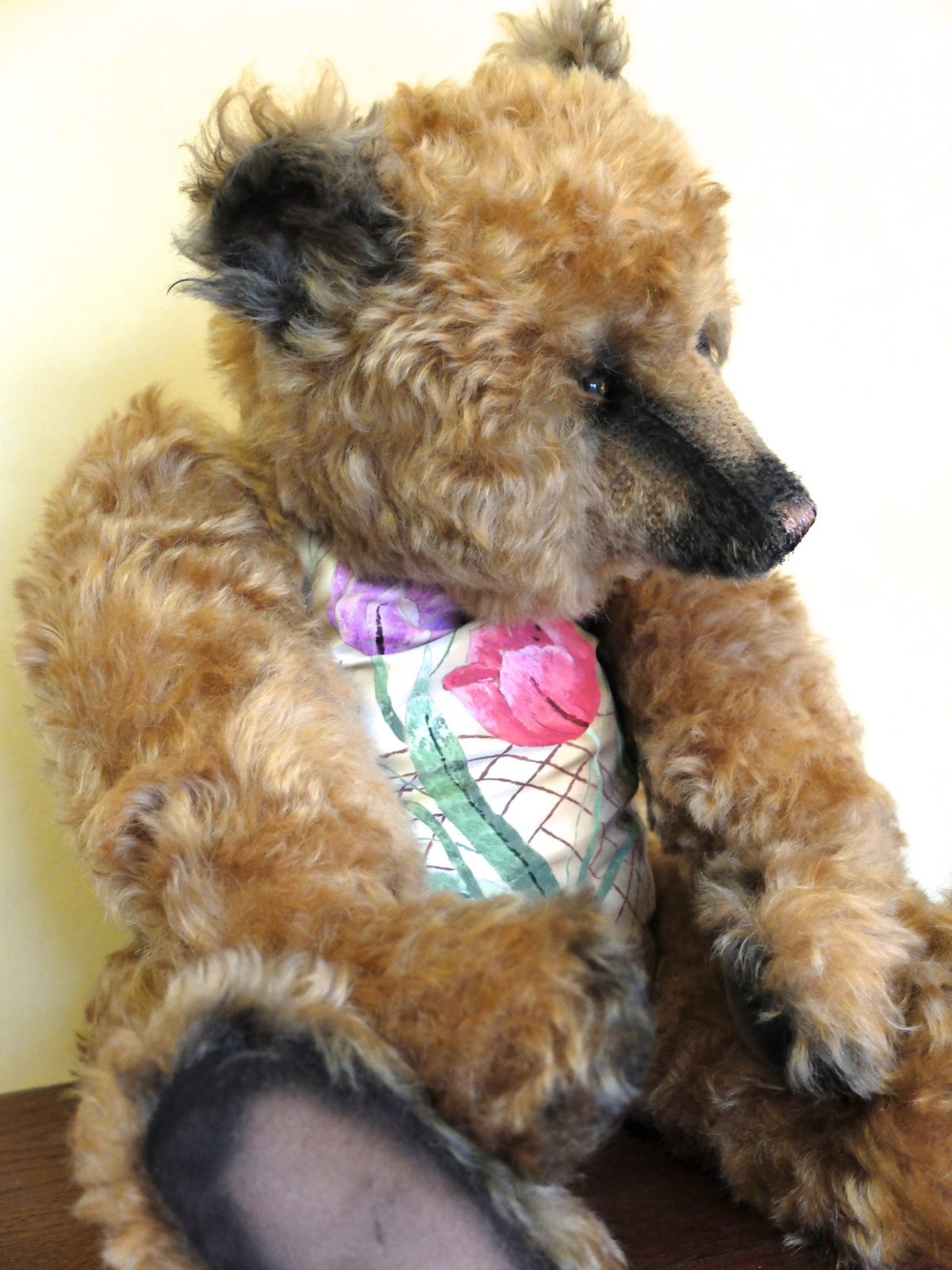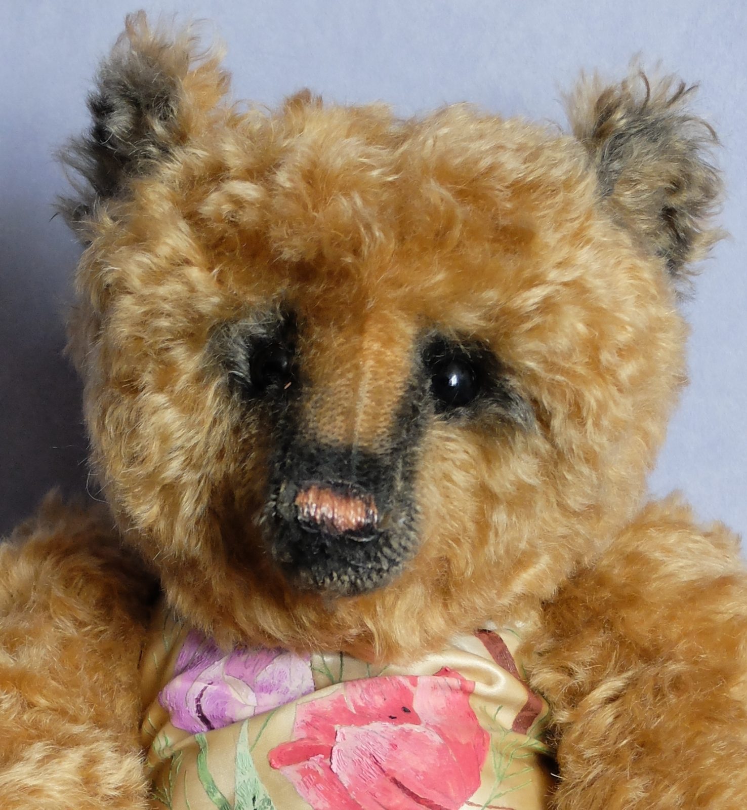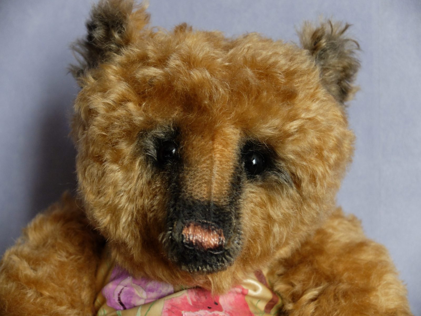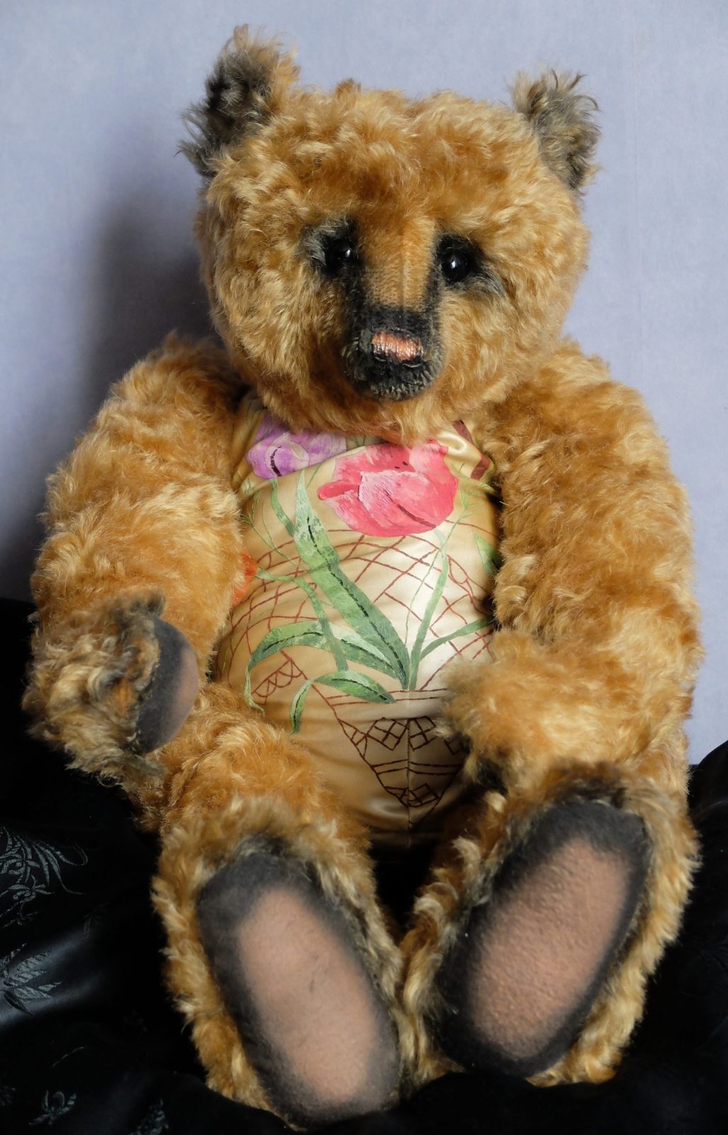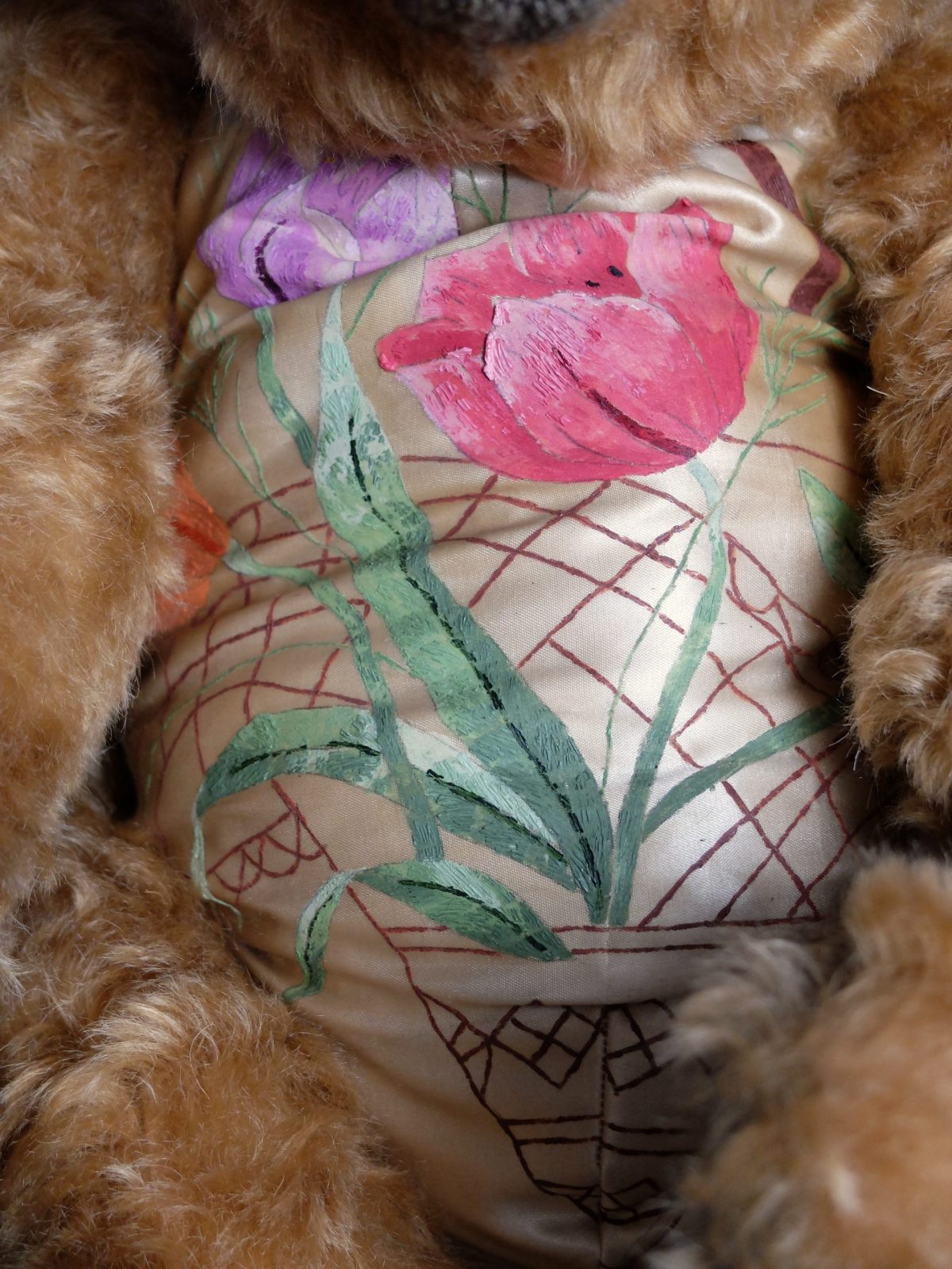 Clarice is made of thick ginger- or perhaps better described as honey-brown mohair with black airbrush details and a pink rather glossy nose. Her front body is made of silk. The silk is hand painted, depicting a flowery motif of an old Clarice Cliff ceramic. Clarice is measuring approx. 58 cm / 23 inches.