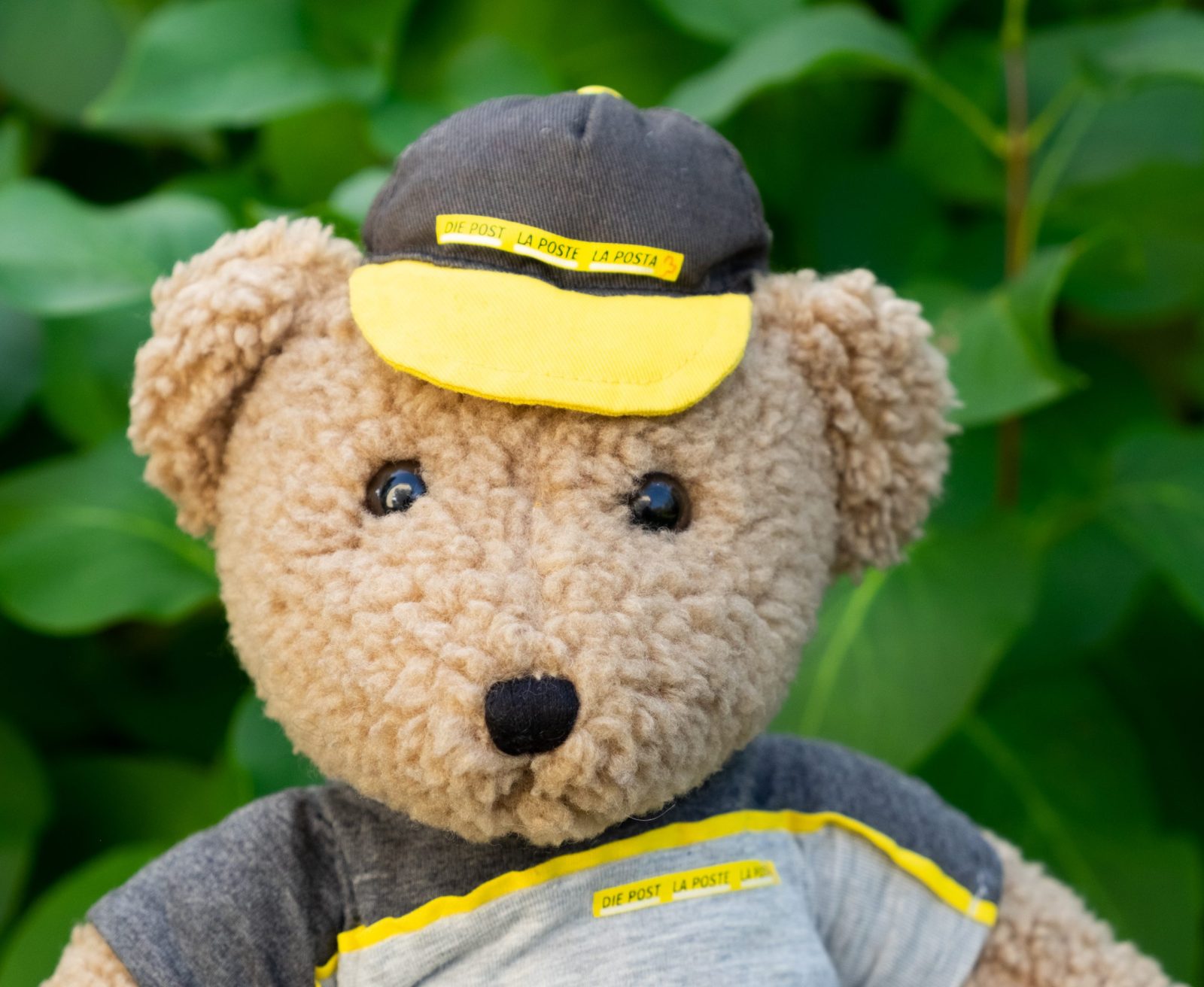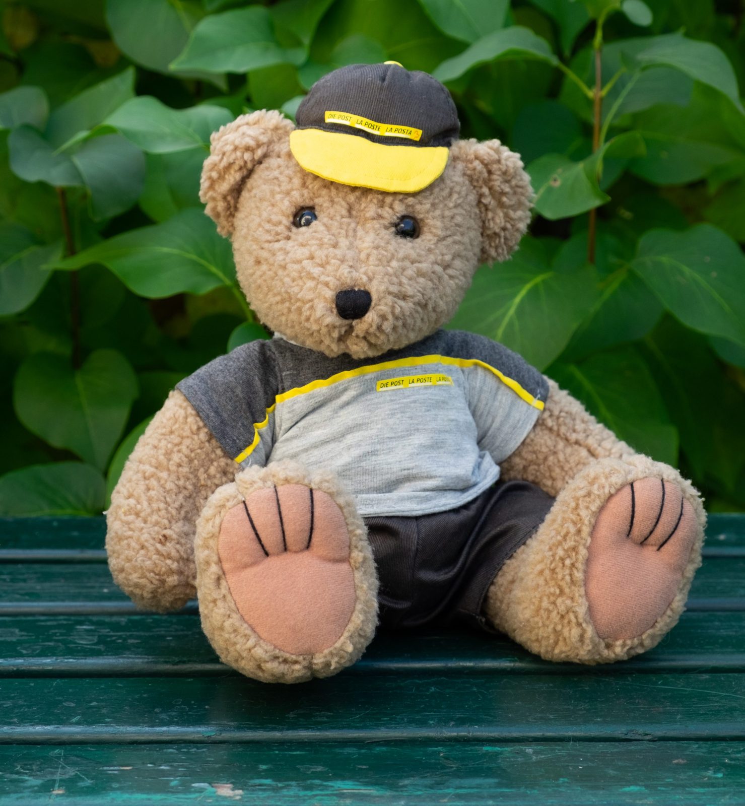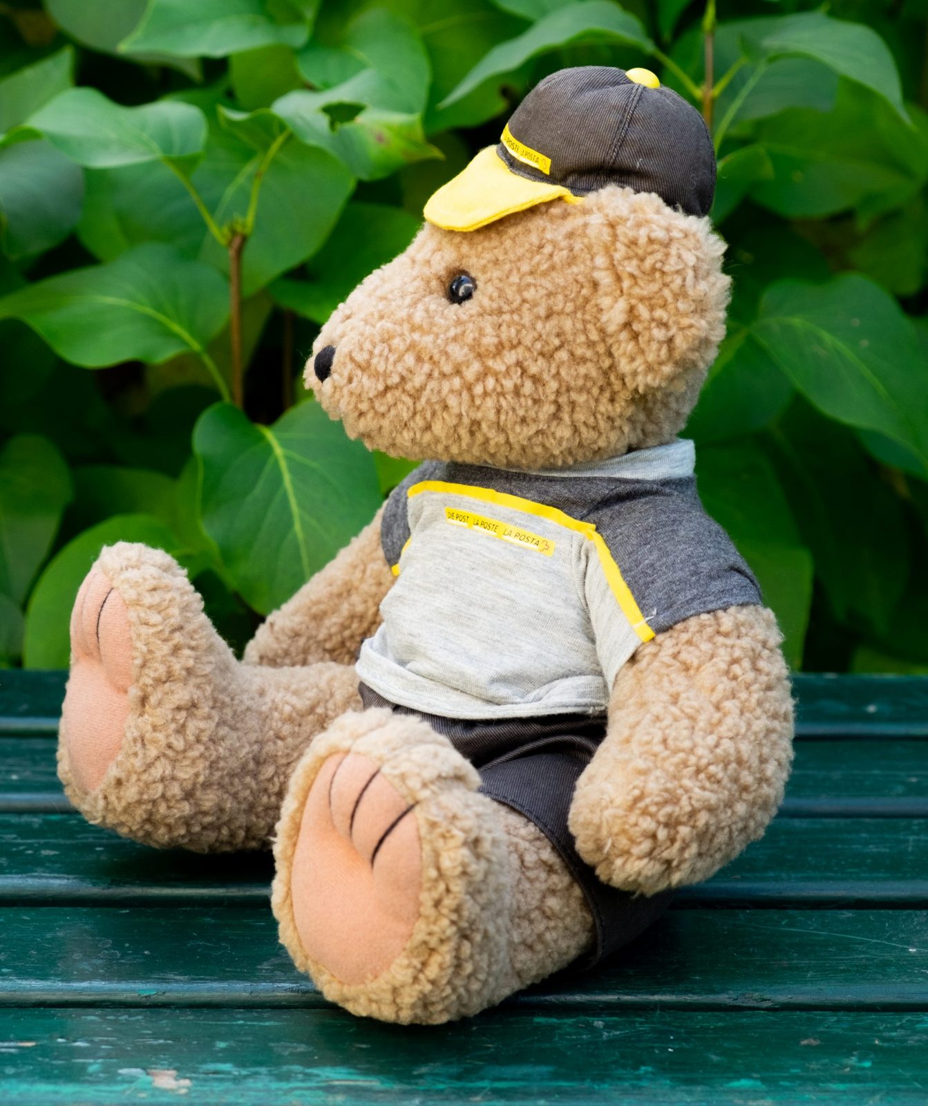 Philibert is the Swiss Post teddy bear. He sports a natty, washable postman’s summer outfit and is made of soft cuddly plush in a greyish brown colour. He has black button eyes and a black stitched nose and claws, and he measures approximately 37 cm / 14″. Philibert was made by Heunec, Germany for the Swiss post in 2002 in order to celebrate the centenary of the teddy bear.