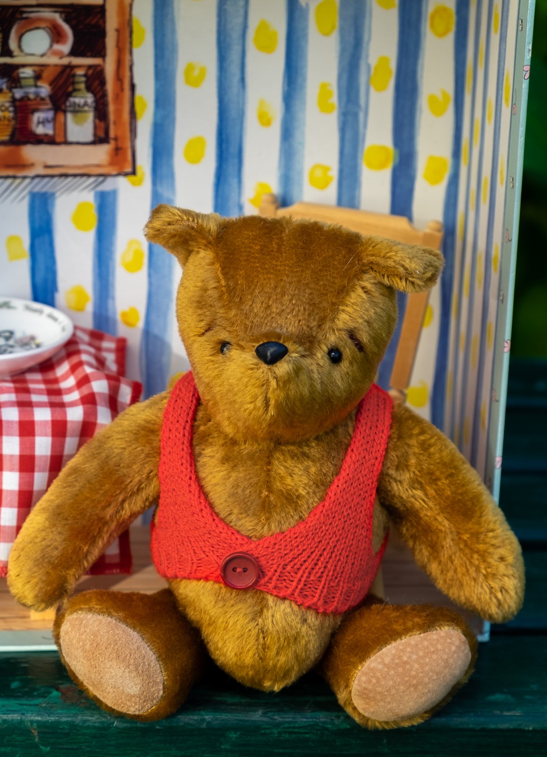 “Time to munch an early luncheon”. Welcome inside the kitchen of Pooh bear! This cooperation between Gabrielle Designs, UK and Royal Doulton, the iconic British tableware firm established in London 1815, was made in a limited edition of 5000 pieces, to my knowledge some time during the 1990s. Winnie-the-Pooh is made of chestnut brown mohair. He has a black nose and black eyes, and he wears a red, knitted waistcoat. He measures 23 cm / 9″. In Pooh’s kitchen you will also find a wooden chair and a table with a tablecloth in red and white. He has a lovely clock made of bone china and a plate, both with motifs from the stories about himself and his friends. Please note that originally included in this set was also a cup, but unfortunately it was broken on delivery, when I received it from the UK many years ago. Certificate is also not included in this set.